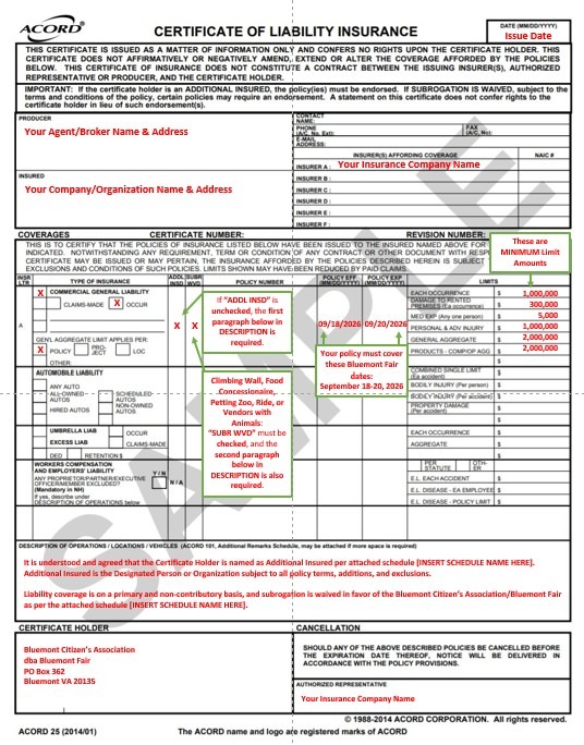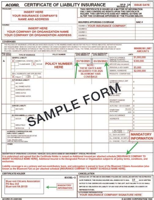 IMPORTANT: If your policy does not include all the required details shown below (also shown in the SAMPLE 2026 BLUEMONT FAIR COI), you will not be permitted to participate in the Fair.