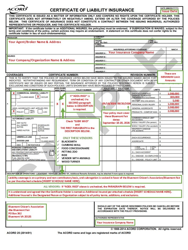IMPORTANT: If your policy does not include all the required details below (also shown in the Sample Bluemont Fair COI), you will not be permitted to participate in the Fair.